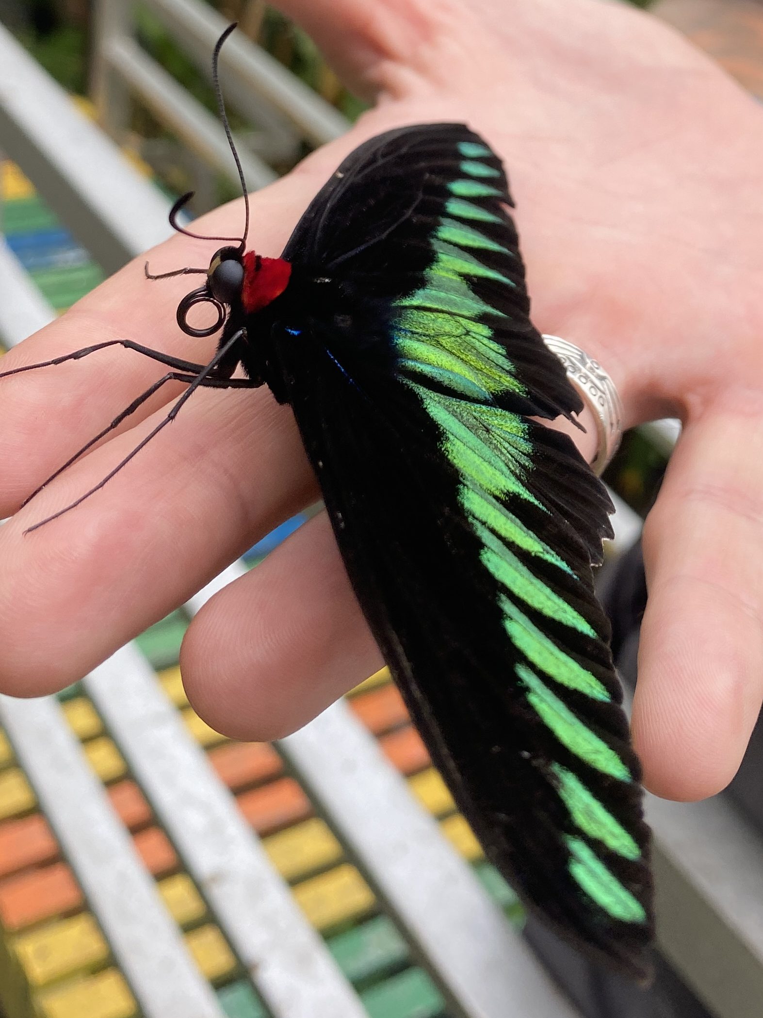 Raja Brooke’s boast as Malaysia’s national butterfly, with an impressive velvet like black and green wingspan, they’re hard to pass unnoticed. The pop of red on the back of their neck seen only sparsely, as they swoop and float away. Despite their size, they of course flutter with elegance and grace, in silence.